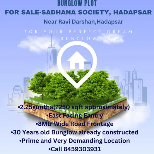 This ad is for a spacious bungalow plot for purchase in Hadapsar, located in Sadhana Society near Ravi Darshan. The plot area is approximately 2250 sqft and is situated within a ga...