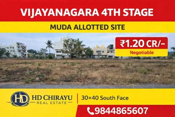 A MUDA allotted site is available for sale in Vijayanagara 4th Stage, Mysore. The site has dimensions of 30 x 40 and faces south. It is located in a prime residential area with dai...