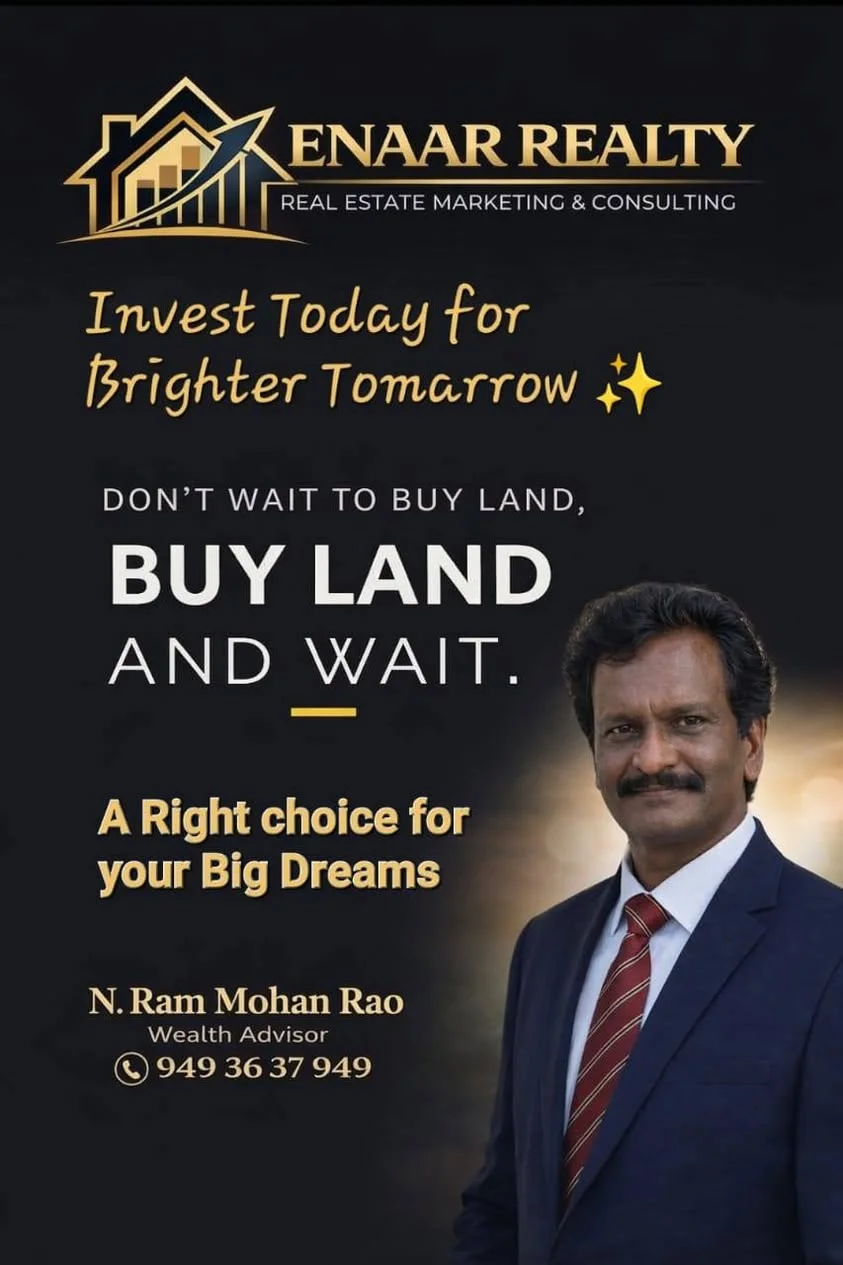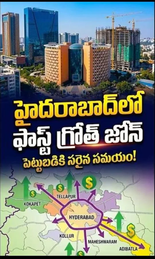 This real estate listing advertises HMDA & RERA-approved plots in a venture with a 100 ft approach road. The gated community offers 24/7 security, CC roads, underground drainage, a...