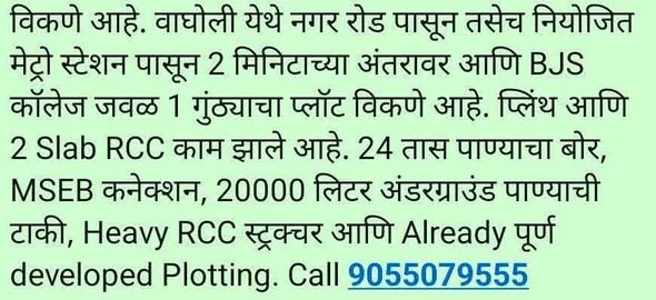 A 1000 sqft plot with plinth and 2 slabs in Wagholi, Pune Corporation is available for sale. The plot is located in Haveli, Maharashtra.