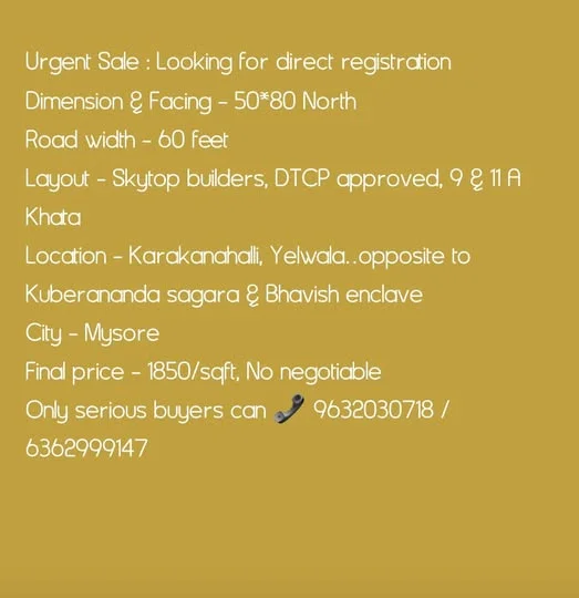 A North-facing site, measuring 50x80, is available for sale in Skytop layout, Karakanhalli, Yelwala, Mysore. The final price is ₹1,850 per sqft and is non-negotiable. Only serious ...