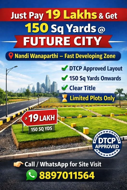 Open plots are available for sale in Future City, Hyderabad, located in Nandi Wanaparthi, a fast-developing zone. The DTCP approved layout offers plots of 150 sq yards onwards. Cle...