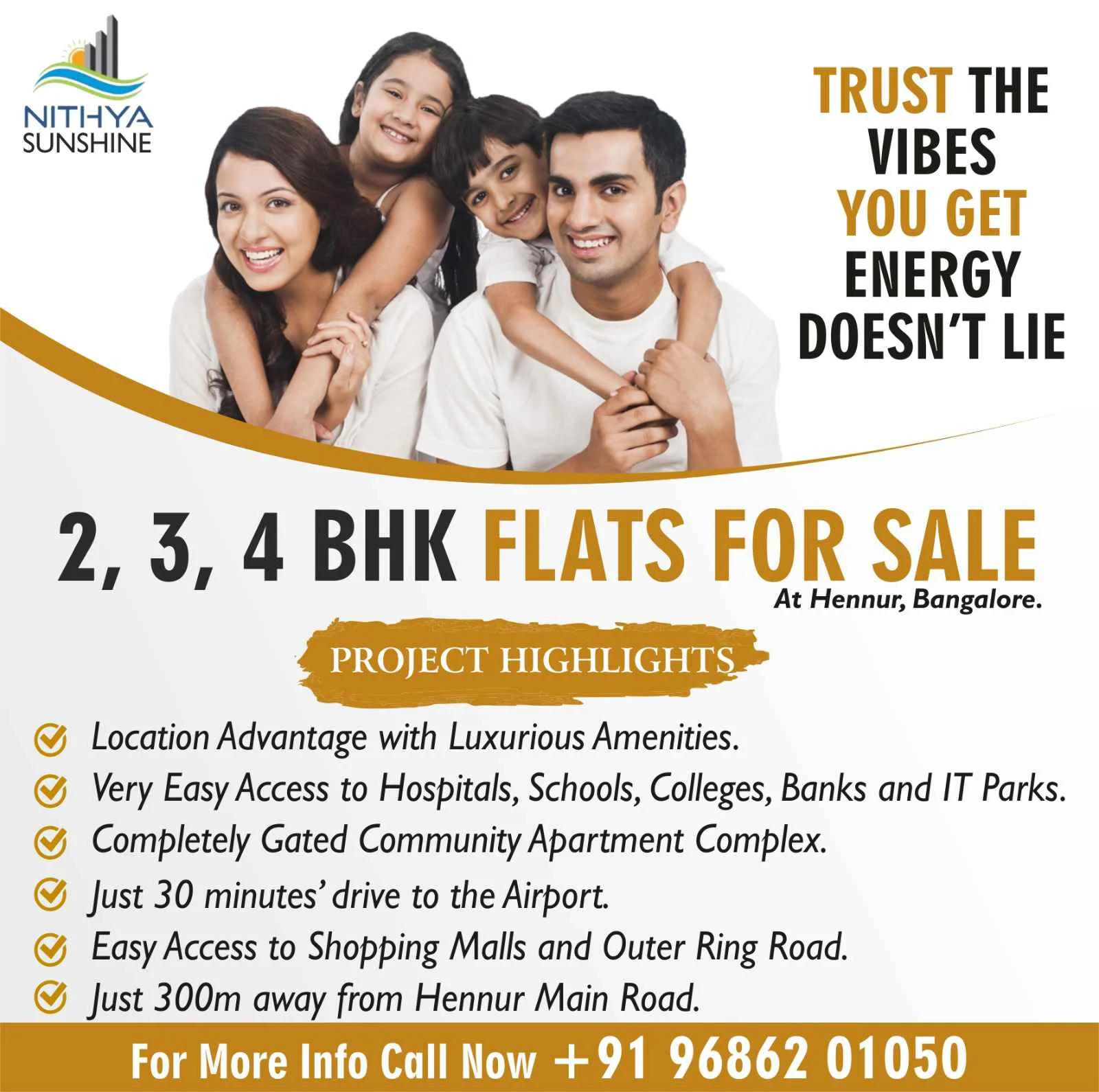 Available for sale are 2BHK, 3BHK, and 4BHK flats in Hennur, near D-Mart. The project is RERA approved with OC and CC, and is expected to be completed in approximately 3 months. It...