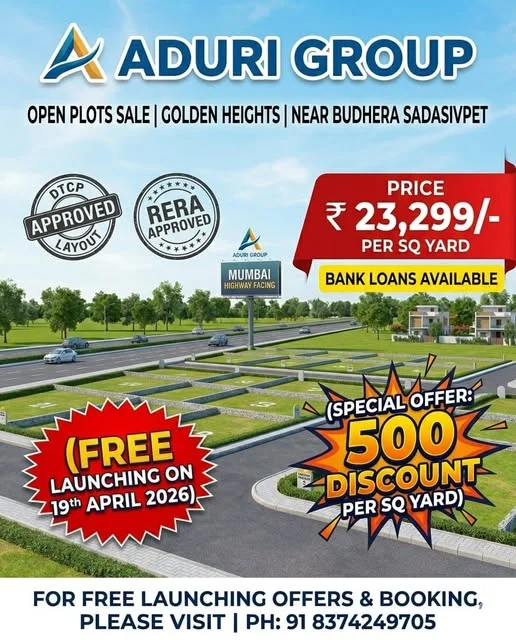 This real estate listing advertises open plots for investment near Sadashivapet, Hyderabad, Telangana, India. The plots are located on Mumbai Highway facing Wencher. For further de...