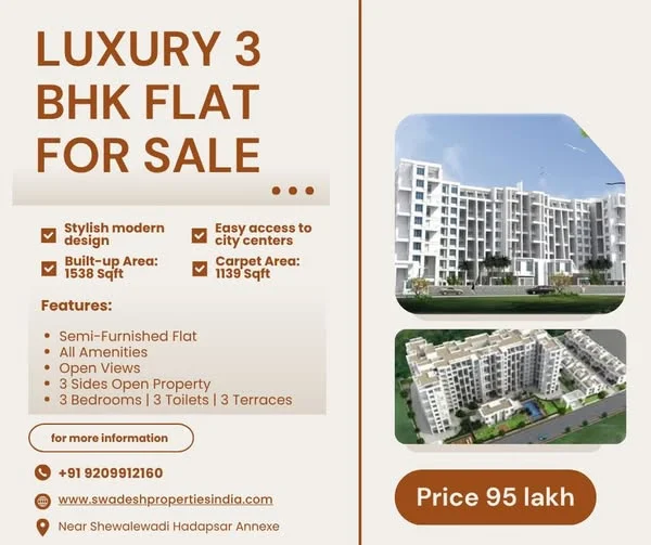 This is a 3BHK flat for sale in Manjri, Pune. The property is priced at ₹9,500,000. Please contact 9209912160 for more information.