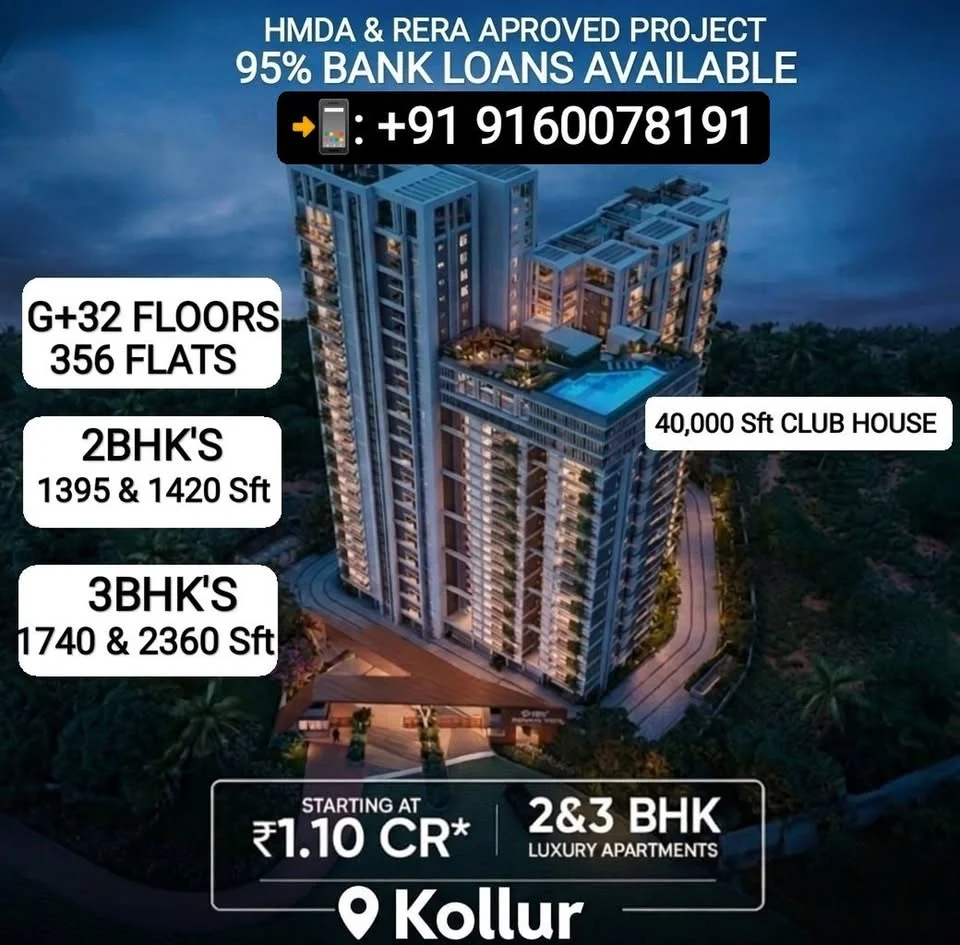 This is an advertisement for MRIDA, a G+32 floor residential project located in Kollur. The project is HMDA and RERA approved. It offers 2 and 3 BHK luxury homes with 95% loan avai...