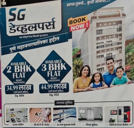 SG Developers presents premium 2 BHK and 3 BHK residential flats within Pune Municipal limits. The 2 BHK flats are available for ₹34.99 Lakh (all-inclusive) with an area of 888 Sq....