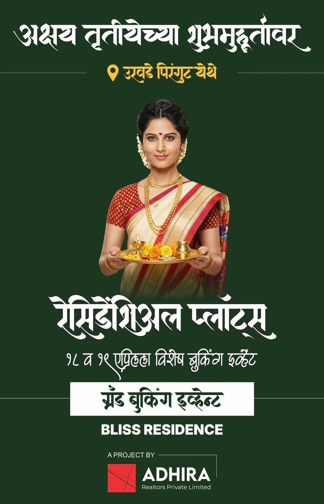 ADHIRA REALTORS presents BLISS RESIDENCY, a grand booking event on April 18th and 19th, 2026, from 9 AM to 5 PM. Located at Urvade, Pirangut. Contact ADHIRA REALTORS for more infor...