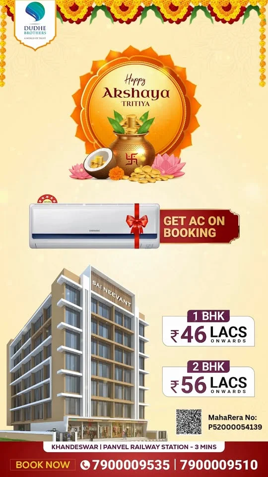 This Akshaya Tritiya, Dudhe Brothers Realty offers homes at Sai Neevant near Khandeshwar/Panvel Station. 1 BHK flats start at ₹46 Lacs and 2 BHK flats start at ₹56 Lacs. A free AC ...