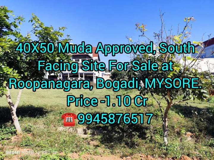 This is an advertisement for a 40X50 MUDA approved south-facing site for sale in Roopnagar Bogadi, Mysore. The asking price is 1.10 Cr.