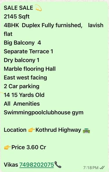 This is a 4BHK duplex flat available for sale. The flat is fully furnished and located on Kothrud Highway service Road. The asking price for the flat is 3.60 Cr.