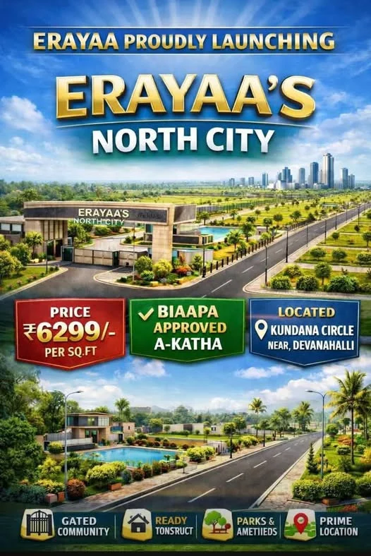 This is an advertisement for plots in ERAYAA NORTH CITY near Kundana Circle, Devanahalli, North Bangalore. The price is ₹6299 per sq.ft. The project is BIAAPA Approved and A-Khata,...