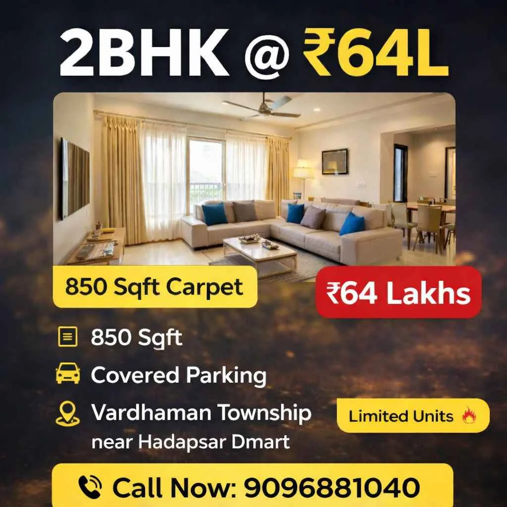 A 2BHK flat is available for sale in Hadapsar, within the Vardhaman Township. The flat offers a carpet area of 850 sqft and includes covered car parking. The society is well-mainta...