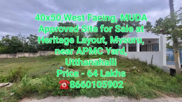 A 40x50 west-facing MUDA approved site is available for sale at Heritage Layout, Mysuru, near APMC Yard, Utthanahalli. The asking price for the site is 64 Lakhs.