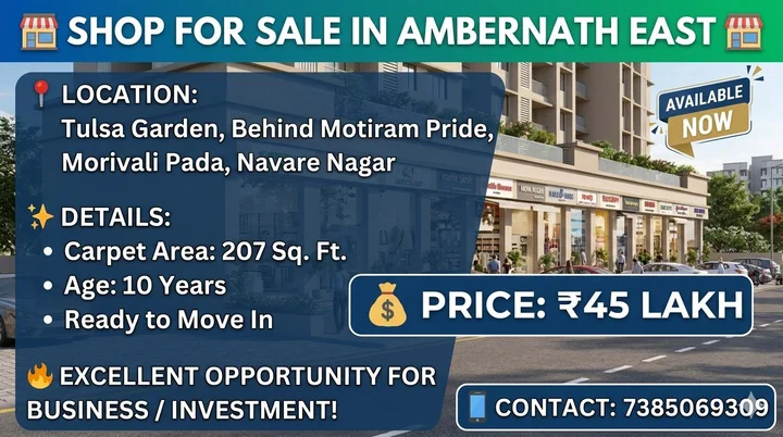 A shop is available for sale in Ambernath East, located behind Tulsa Garden, Motiram Pride, in Morivali Pada, Navare Nagar. The carpet area is 207 sq ft and the property is 10 year...