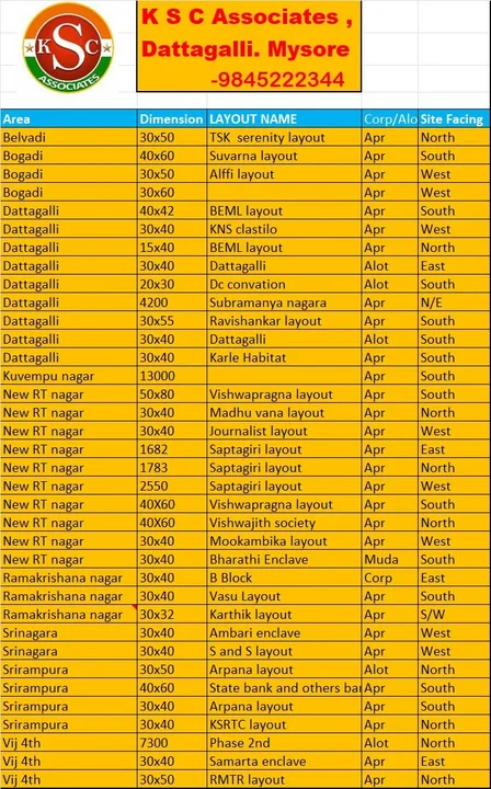 This is a real estate advertisement for sites for sale in Mysore. For more details, please contact K S C Associates in Dattagalli, Mysore.