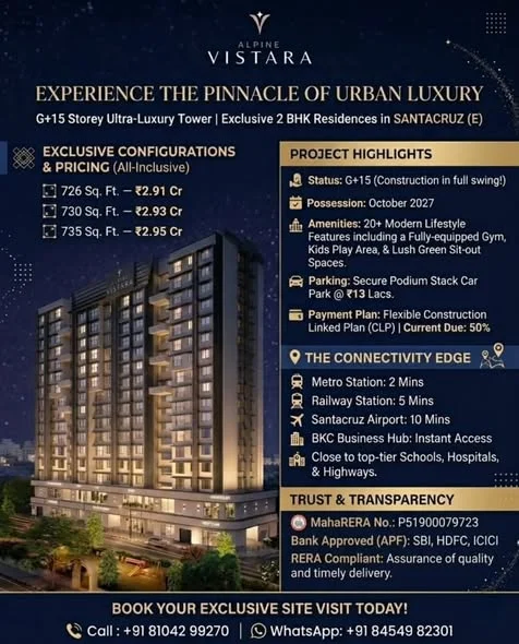 Alpine Vistara is an under-construction ultra-luxury tower in Santacruz (E), Mumbai, offering premium 2 BHK residences ranging from 726 to 735 sq.ft. starting from ₹2.91 Cr. It is ...