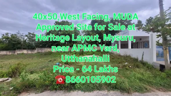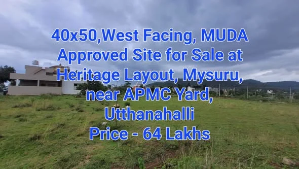 This is a West facing, MUDA approved 40x50 site for sale at Heritage Layout, Mysuru, near APMC Yard, Utthanahalli. The price is 64 Lakhs.