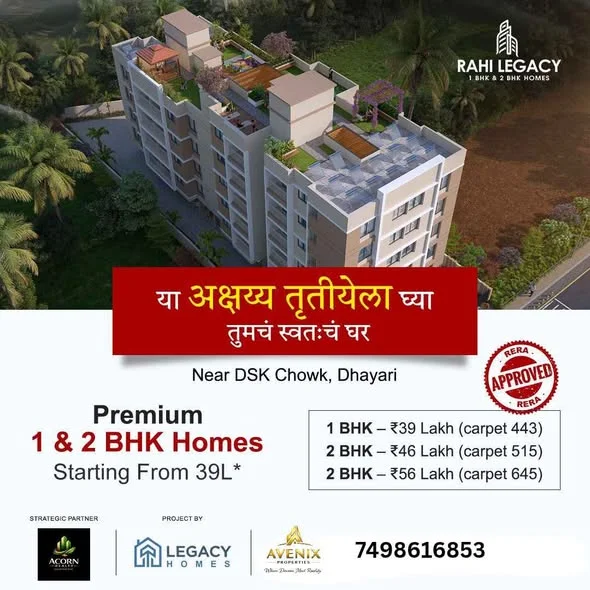 This ad promotes 1 and 2 BHK homes near DSK Chowk, Dhayari, starting from ₹39 Lakh. The project offers a peaceful location and modern amenities and is RERA approved. Contact inform...