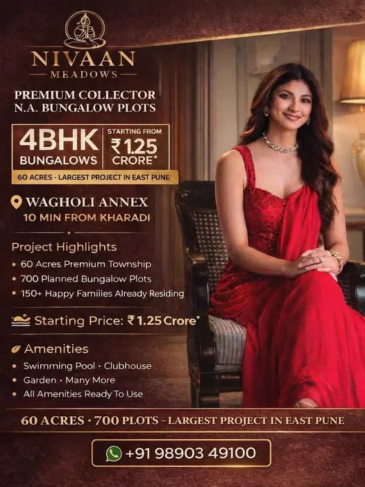 Premium 4BHK bungalow plots in NIVAAN MEADOWS, a 60-acre premium township located in Wagholi Annex, just 10 minutes from Kharadi. The project features over 700 planned bungalow plo...