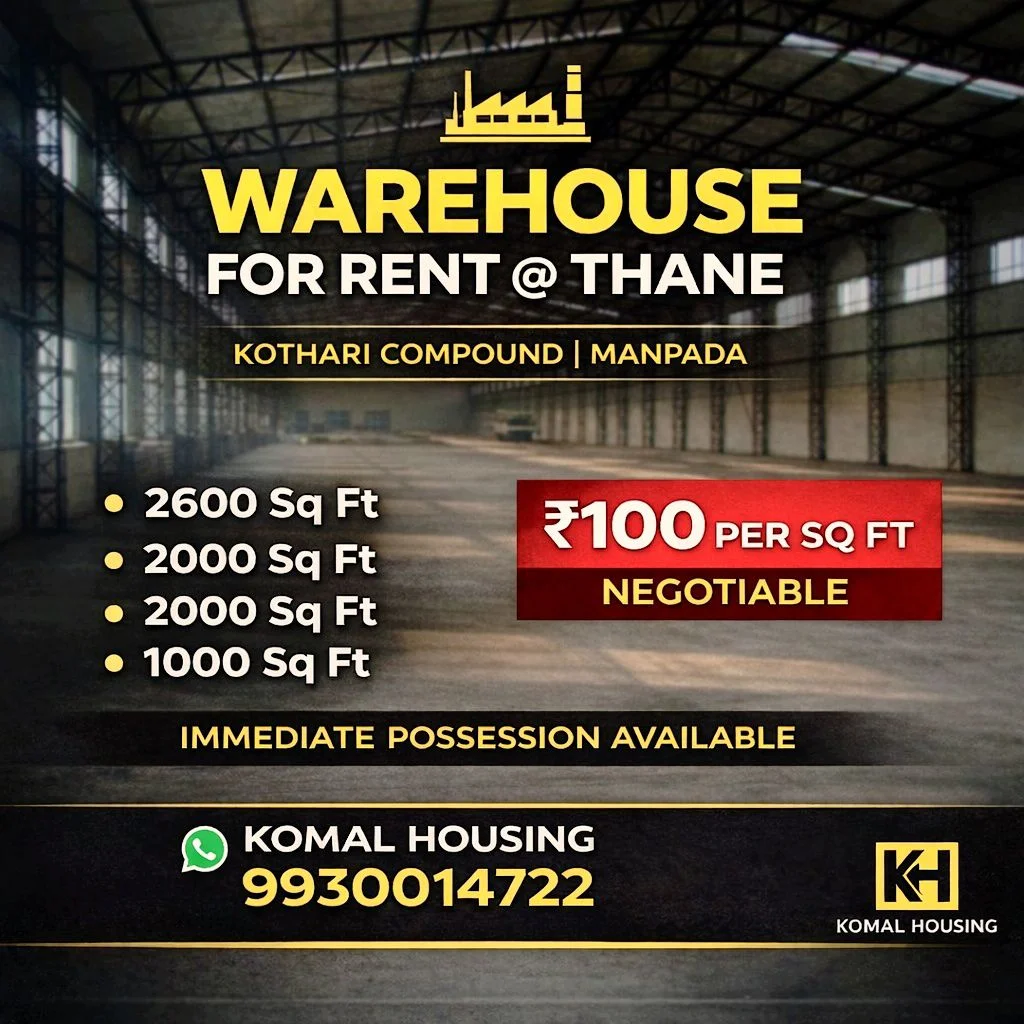 This listing advertises warehouse, industrial gala, and storage spaces for rent in Thane West, specifically in Manpada near Ghodbundar Road. The available spaces include a 2600 sq ...