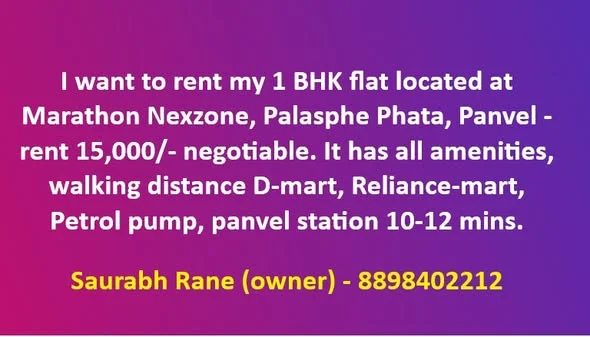 A 1 BHK flat is available for rent at Marathon Nexzone, Panvel, Palasphe Phata starting May 2026. The rent is ₹15,000 and is negotiable. This is a property directly from the owner,...