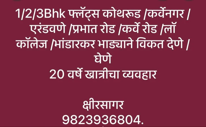 Advertisment for 1/2/3 bedroom flats available for rent or sale in Pune. Specifically in Kothrud, Karve Nagar, Erandwane, Warje, Prabhat Road, and Law College Road. The advertiseme...