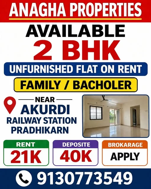 This is a hot rental deal in Akurdi, featuring a 2 BHK unfurnished flat in a prime location near Akurdi Railway Station, Pradhikaran. The rent is ₹21,000 and the deposit is ₹40,000...