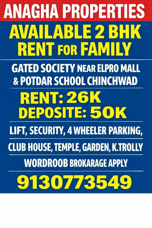 2 BHK Flat for Rent Near Elpro Mall & Potdar School