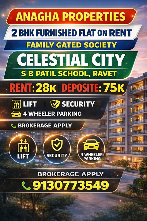 This is a 2 BHK fully furnished flat available for rent in Celestial City, near S B Patil School, Ravet. It is perfect for families and located within a safe, gated society. The re...