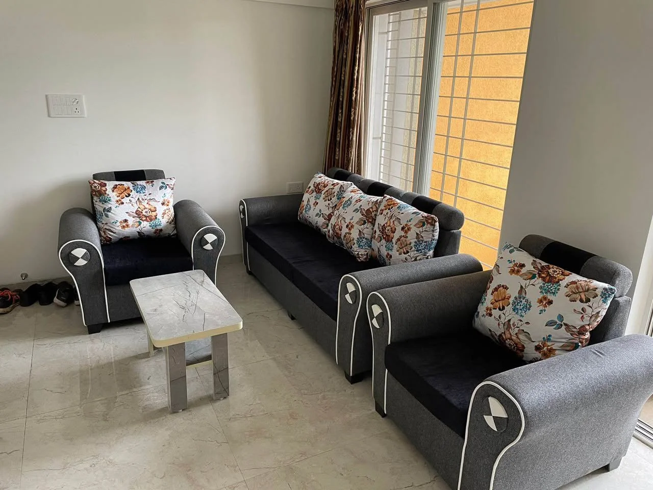 This is a fully furnished 2 BHK flat for rent. The flat includes a sofa set, TV unit, shoe rack, and a modular kitchen with trolley and cabinets, along with a gas hob, refrigerator...