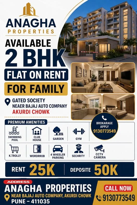 This is a hot deal alert for a premium 2 BHK flat for rent in Akurdi, presented by Anagha Properties. Located in a prime location near Bajaj Auto Company and Akurdi Chowk, this fam...
