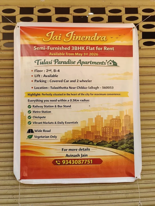 A semi-furnished 3BHK flat is available for rent in Tulasi Paradise Apartments, located in Tulasithotta near Chikka-lalbagh. The flat is on the 2nd floor (Unit B-4) and includes li...