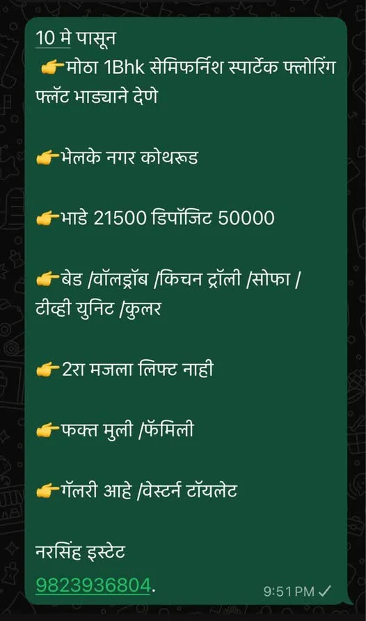 This is a rental listing for a furnished 1BHK apartment in Bhelke Nagar, Kothrud, Pune. The rent is $21,000. The property is available for girls or families. Brokerage is applicabl...