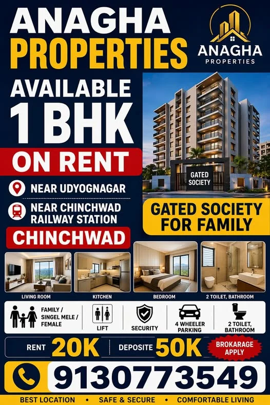 A 1 BHK flat is available for rent near Chinchwad Station, ideal for families and bachelors. It is located in a gated society near Udyognagar and the Railway Station. The flat is s...