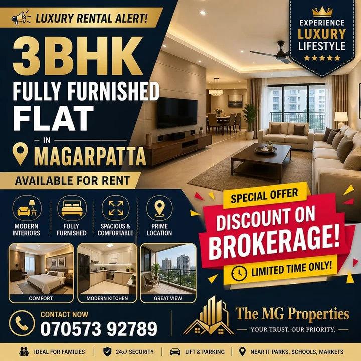 This is an ad for a fully furnished 3BHK flat located in the prime location of Magarpatta. The flat features modern interiors and is ready to move in. A special offer includes a di...
