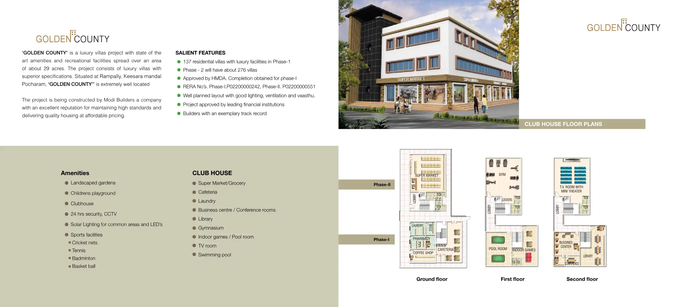 'GOLDEN COUNTY' is a luxury villas project with state of the art amenities and recreational facilities spread over an area of about 29 acres. The project consists of luxury villas with superior specifications. Situated at Rampally, Keesara mandal Poc...