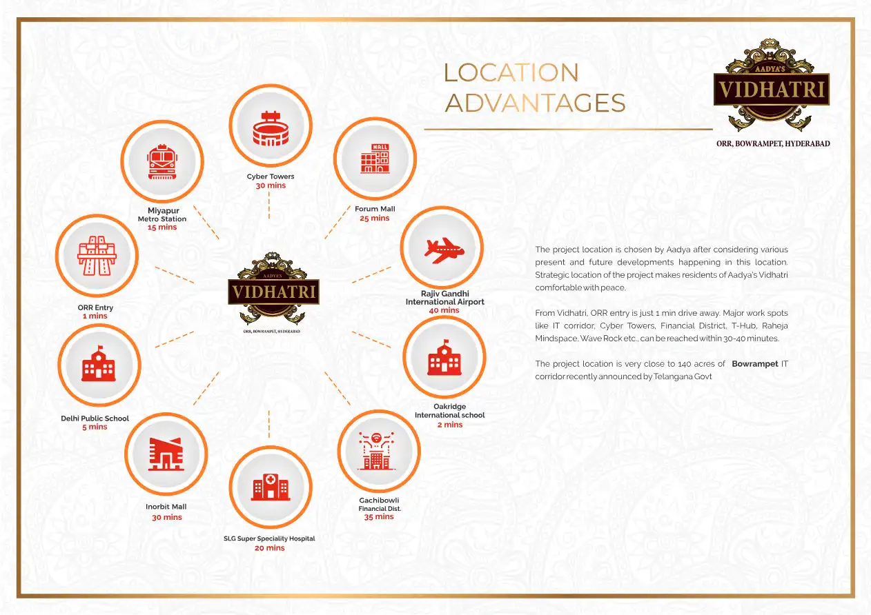 A premium residential apartment project at Bowrampet, Hyderabad, Telangana. Located in close proximity of Hi-Tech City & Financial District, abutting Nehru Outer Ring Road and IT corridor of Hyderabad and very near to major International schools & En...