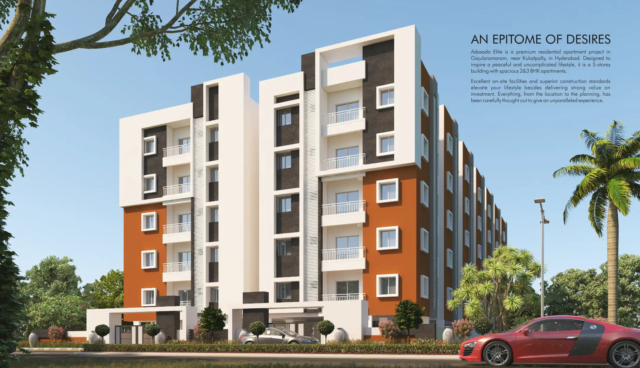 Adasada Elite is a premium residential apartment project in Gajularamaram, near Kukatpally, in Hyderabad. Designed to inspire a peaceful and uncomplicated lifestyle, it is a 5-storey building with spacious 2&3 BHK apartments.