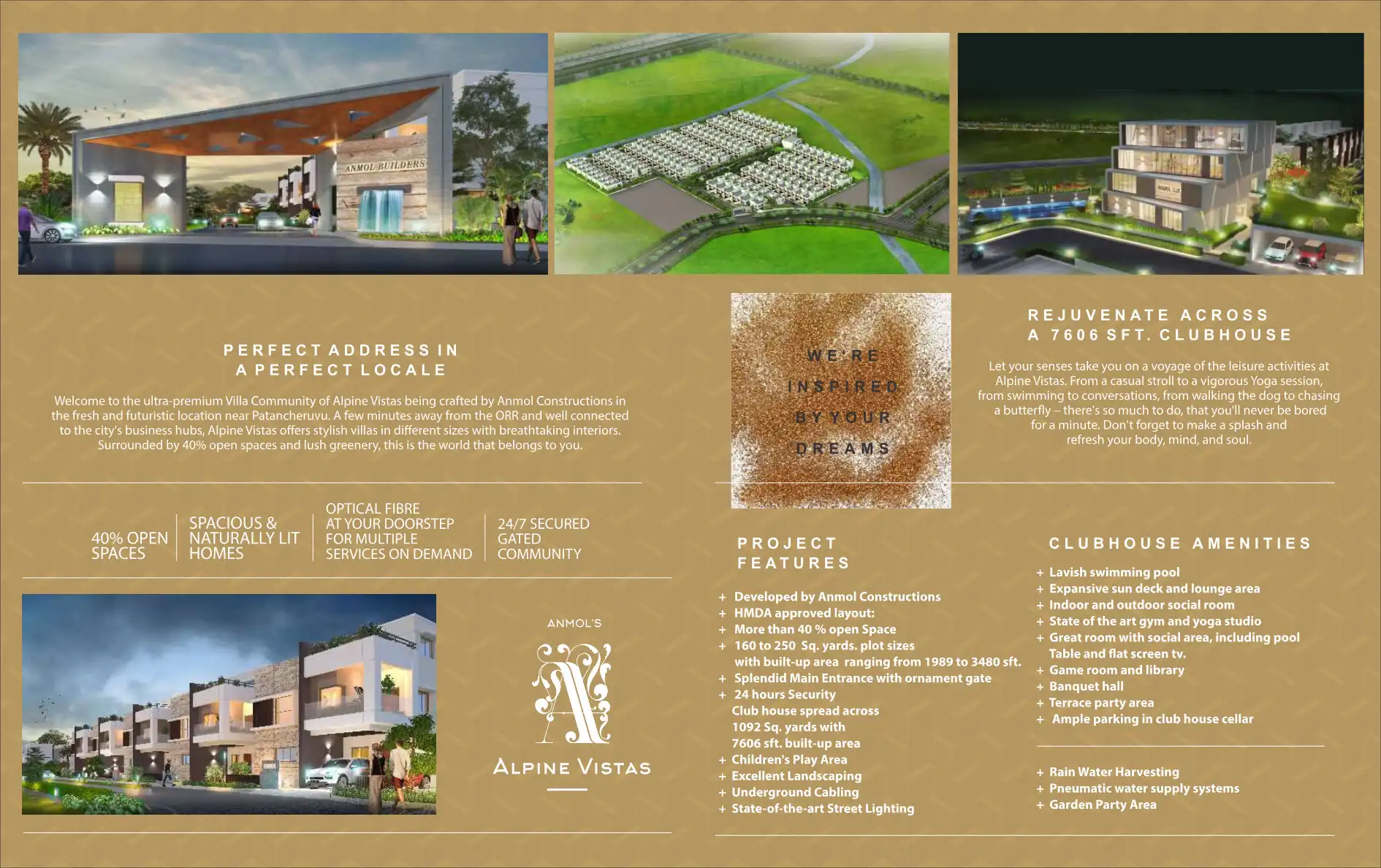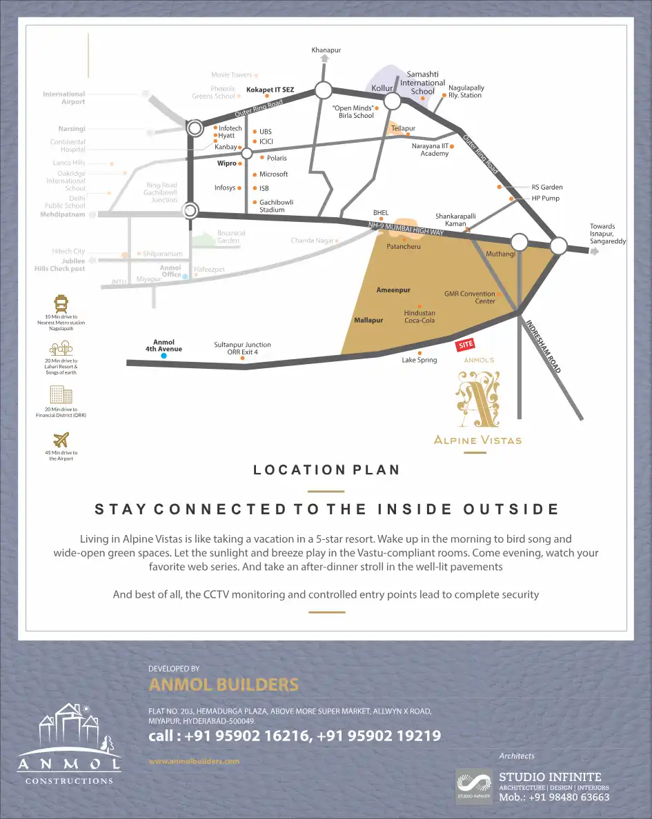 Welcome to the ultra-premium Villa Community of Alpine Vistas being crafted by Anmol Constructions in the fresh and futuristic location near Patancheruvu. A few minutes away from the ORR and well connected to the city's business hubs, Alpine Vistas o...