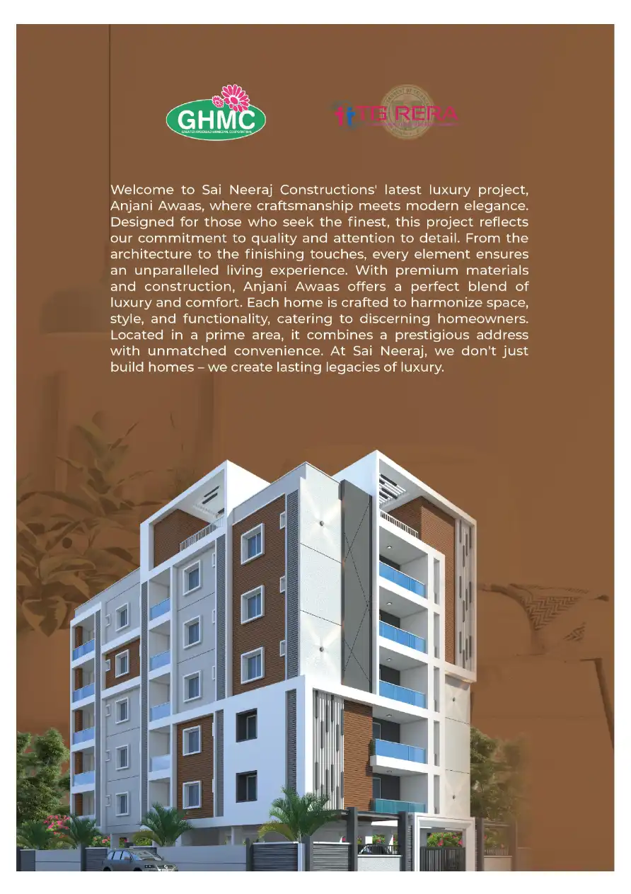 Welcome to Sai Neeraj Constructions' latest luxury project, Anjani Awaas, where craftsmanship meets modern elegance. Designed for those who seek the finest, this project reflects our commitment to quality and attention to detail. From the architectur...