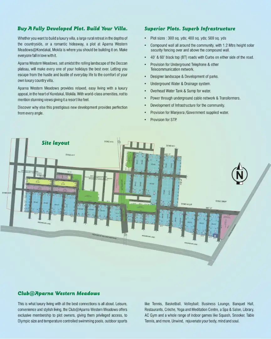 Aparna Western Meadows provides relaxed, easy living with a luxury appeal, in the heart of Kondakal, Mokila. With world-class amenities, not to mention stunning views giving it a resort like feel.