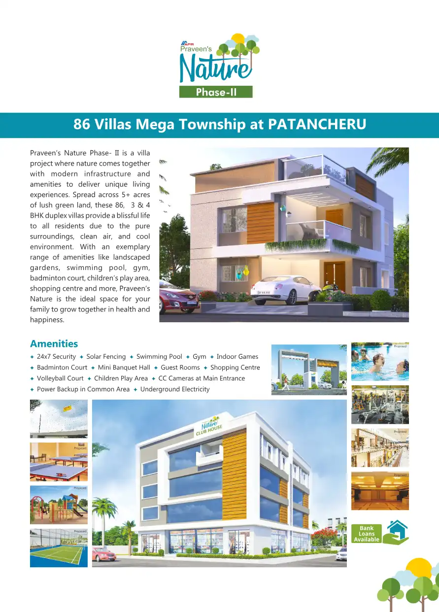 Praveen's Nature Phase- II is a villa project where nature comes together with modern infrastructure and amenities to deliver unique living experiences. Spread across 5+ acres of lush green land, these 86, 3 & 4 BHK duplex villas provide a blissful l...