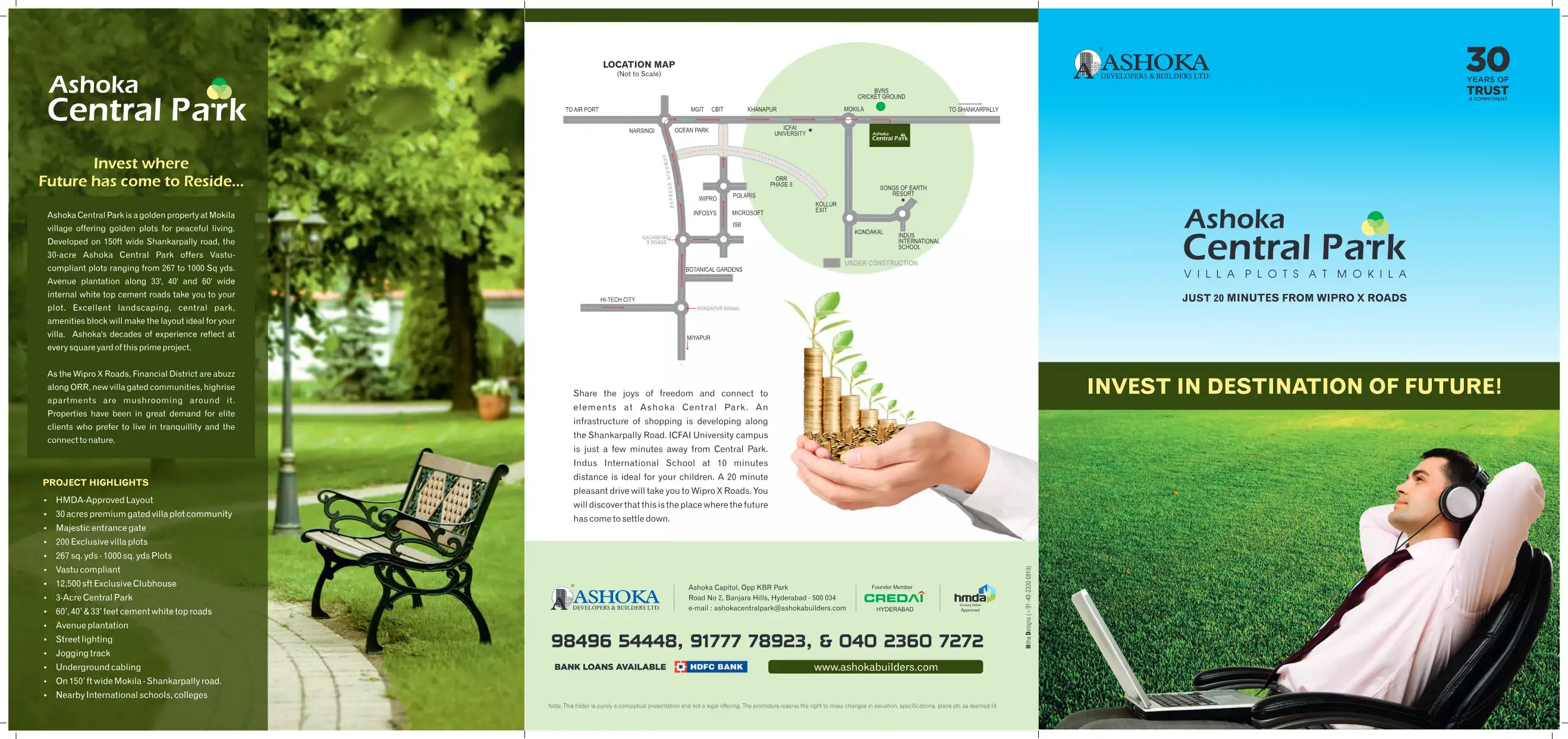 Ashoka Central Park is a golden property at Mokila village offering golden plots for peaceful living. Developed on 150ft wide Shankarpally road, the 30-acre Ashoka Central Park offers Vastu- compliant plots ranging from 267 to 1000 Sq yds.