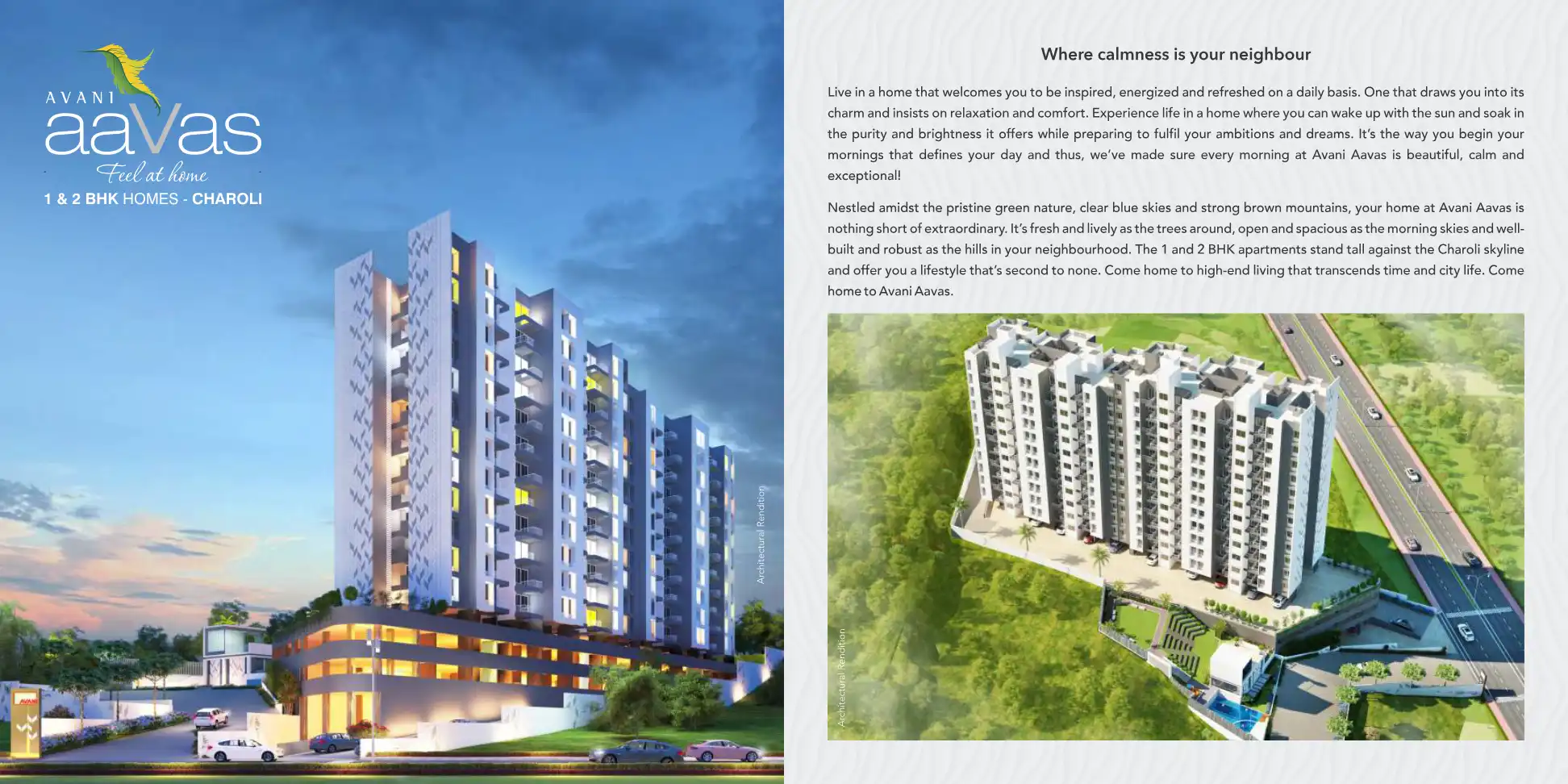 Escape the city chaos and step into a world surrounded by serenity and happiness at Avani Aavas. Strategically located in Charoli, the project comprises 1 and 2 BHK apartments that reflect peace and tranquillity in every sq. ft. With a host of refres...