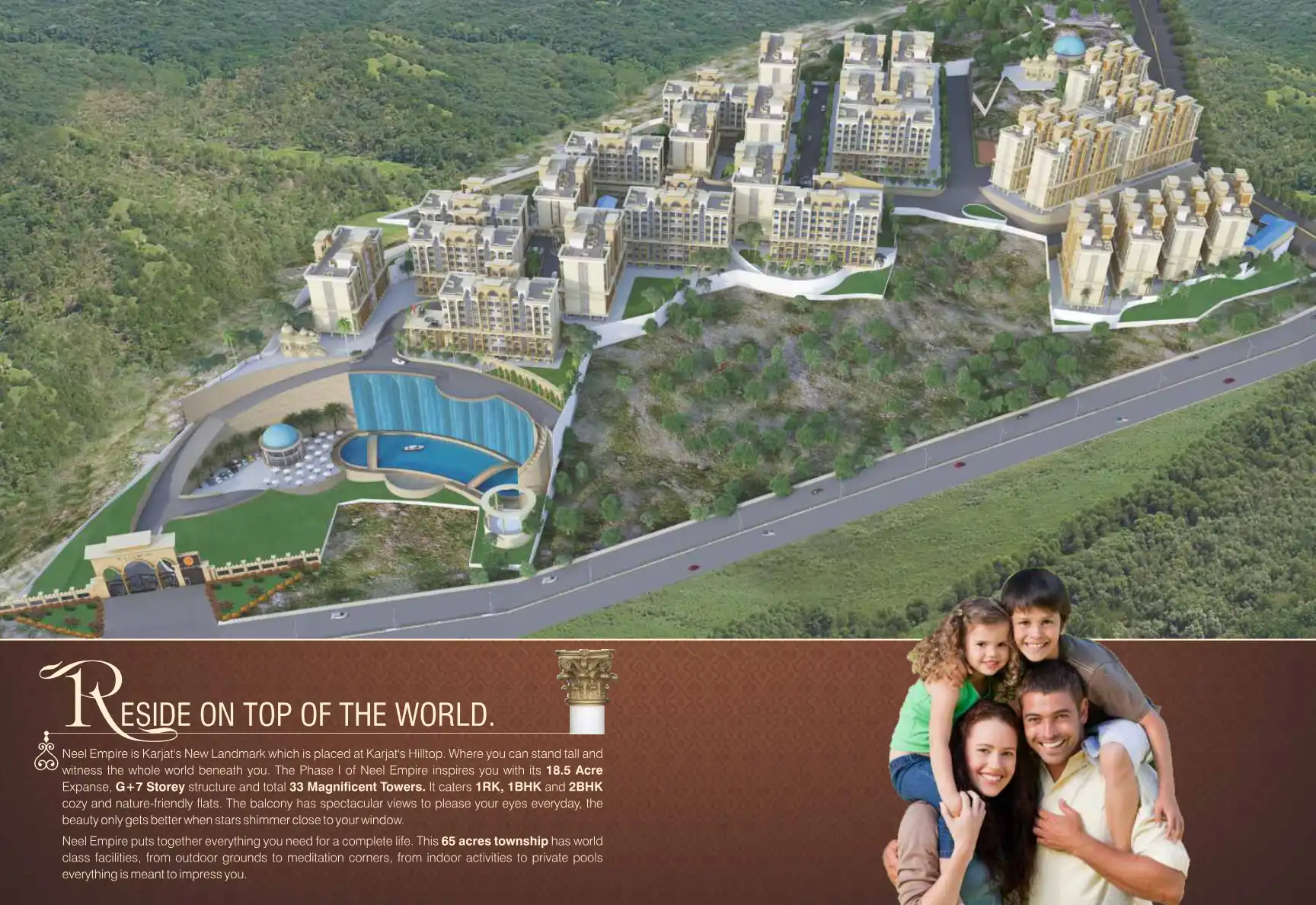 Neel Empire is Karjat's New Landmark which is placed at Karjat's Hilltop. The Phase I of Neel Empire inspires you with its 18.5 Acre Expanse, G+7 Storey structure and total 33 Magnificent Towers. It caters 1RK, 1BHK and 2BHK cozy and nature-friendly ...