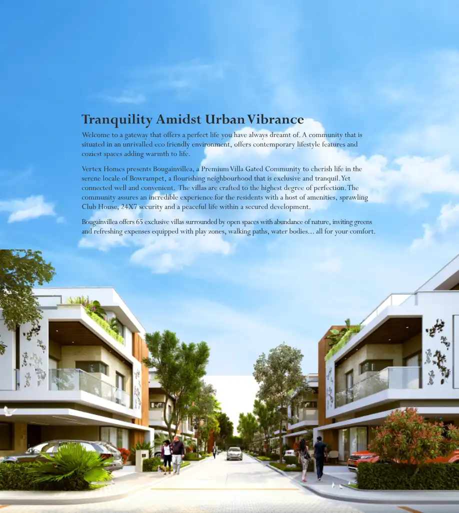 Vertex Homes presents Bougainvillea, a Premium Villa Gated Community to cherish life in the serene locale of Bowrampet, a flourishing neighbourhood that is exclusive and tranquil. Yet connected well and convenient. The villas are crafted to the highe...