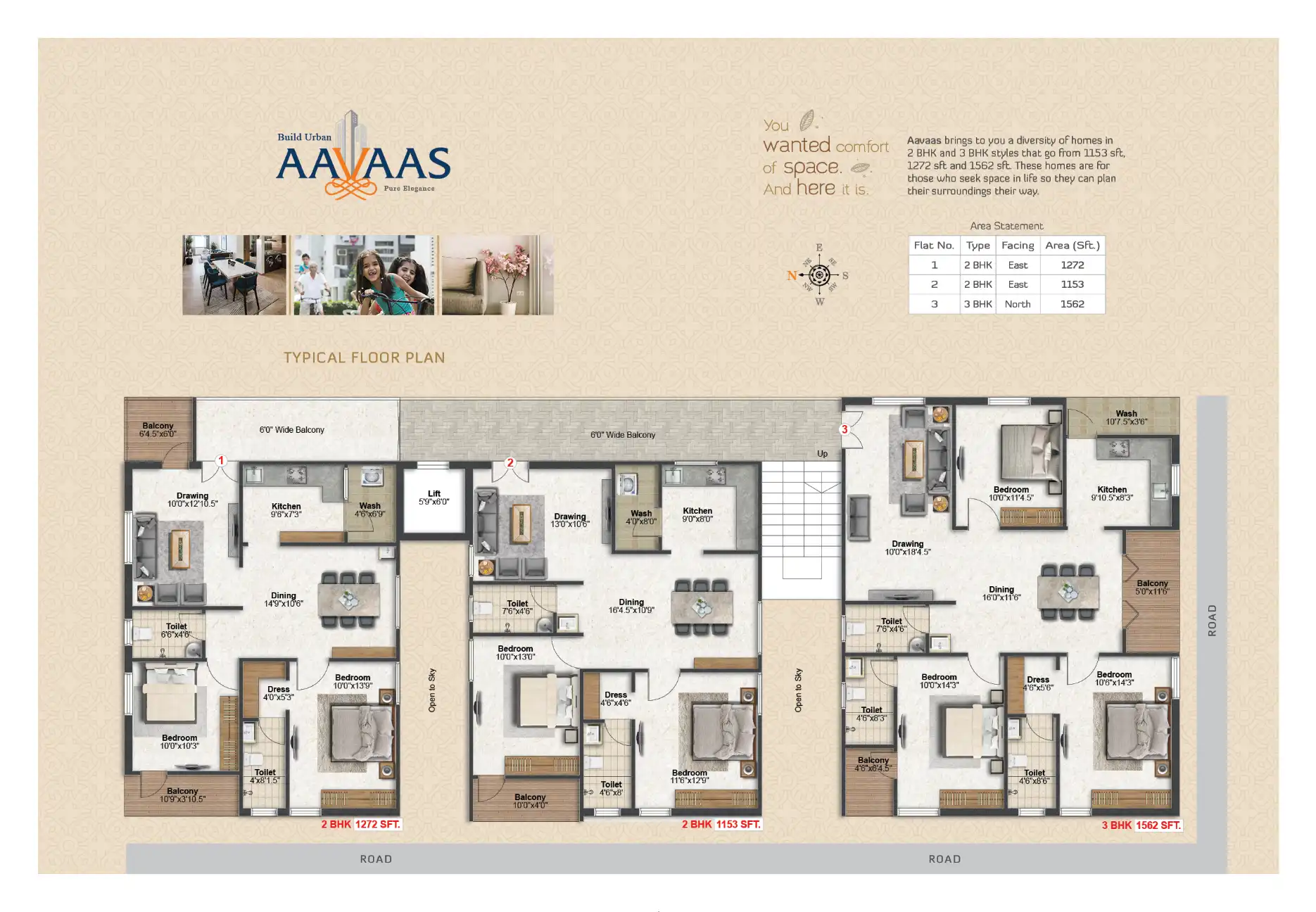 Aavaas brings to you a diversity of homes in 2 BHK and 3 BHK styles that go from 1153 sft, 1272 sft and 1562 sft. These homes are for those who seek space in life so they can plan their surroundings their way.