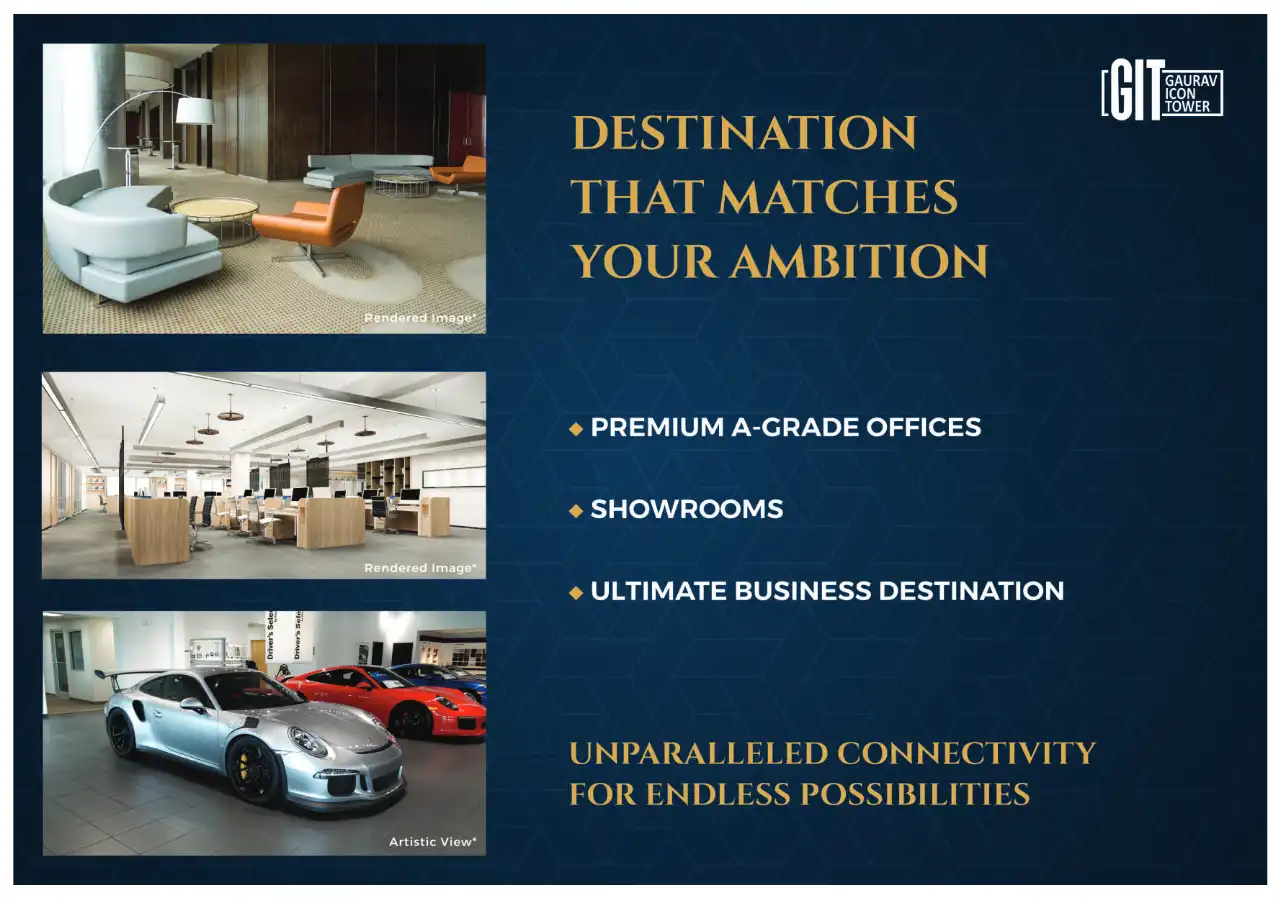 Gaurav Icon Tower offers premium commercial offices and retail showrooms for your vision. A modern-day marvel where ideas meet innovation - to transcend your dream vision into reality and much more.