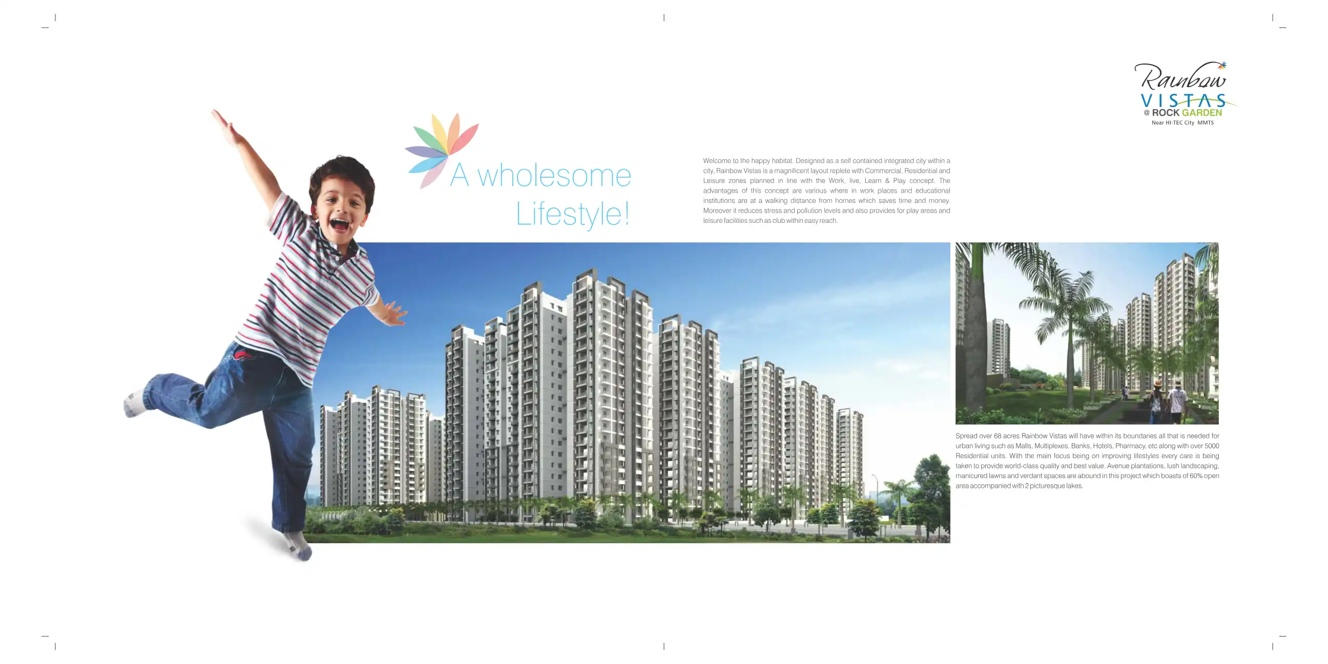 Designed as a self-contained integrated city within a city, Rainbow Vistas is a magnificent layout replete with Commercial, Residential and Leisure zones planned in line with the Work, live, Learn & Play concept.